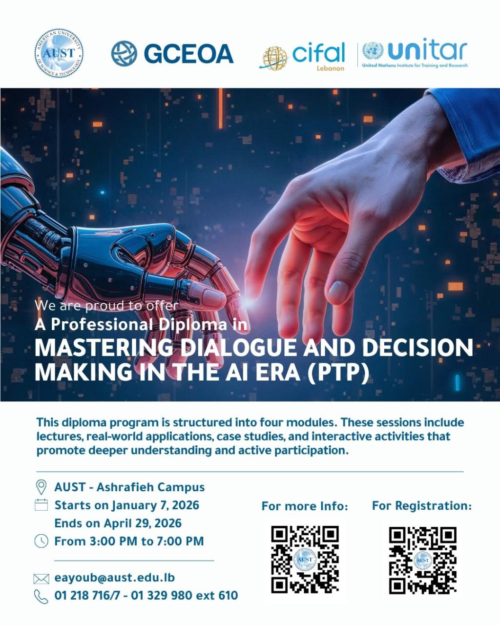 In an increasingly complex global environment shaped by rapid technological advancement and the growing influence of artificial intelligence, effective dialogue, ethical decision-making, and constructive negotiation have become essential skills across sectors. This professional diploma programme CGN.2025.001/QA FORM responds to the need for structured capacity-building in negotiation, persuasion, and decision-making, while addressing the opportunities and risks introduced by AI-driven tools. Delivered by the American University of Science and Technology in collaboration with CIFAL Lebanon, the programme aligns with the United Nations Sustainable Development Goals (SDGs) by promoting peaceful dialogue, ethical practices, inclusive decision-making, and responsible use of emerging technologies. CIFAL Lebanon’s involvement ensures that the programme integrates a global development perspective consistent with UNITAR’s capacity-building mandate.
