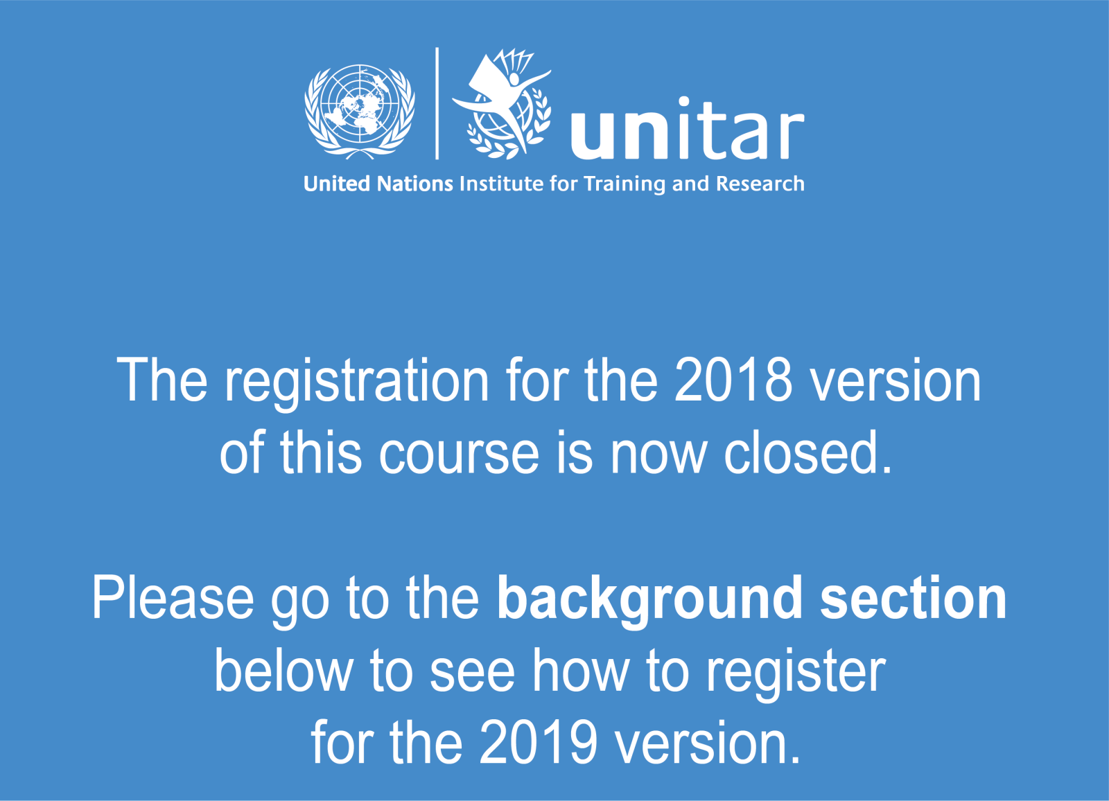 The personal data of participants applying for, registering for or participating in UNITAR's training courses and other events is governed by the Data Protection and Privacy Policy. By applying for, registering for or participating in this event, the participant acknowledges that he or she is, (or they are) aware of the policy and agree to its terms.